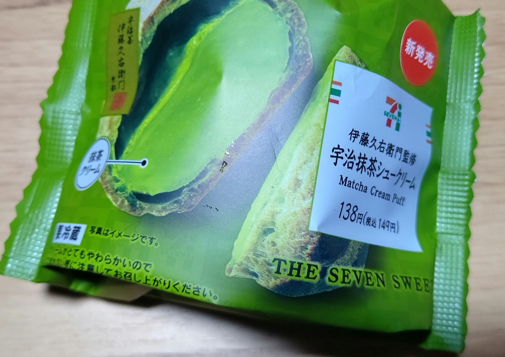 セブンの宇治抹茶のシュークリーム!渋いけど甘い!不思議な食感!宇治抹茶だけにすべてが緑!抹茶スイーツ好きな人にはたまらなそうだ!見かけたら是非!