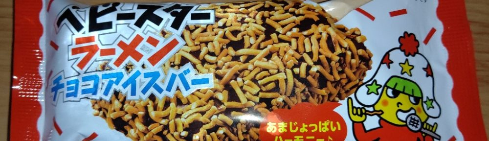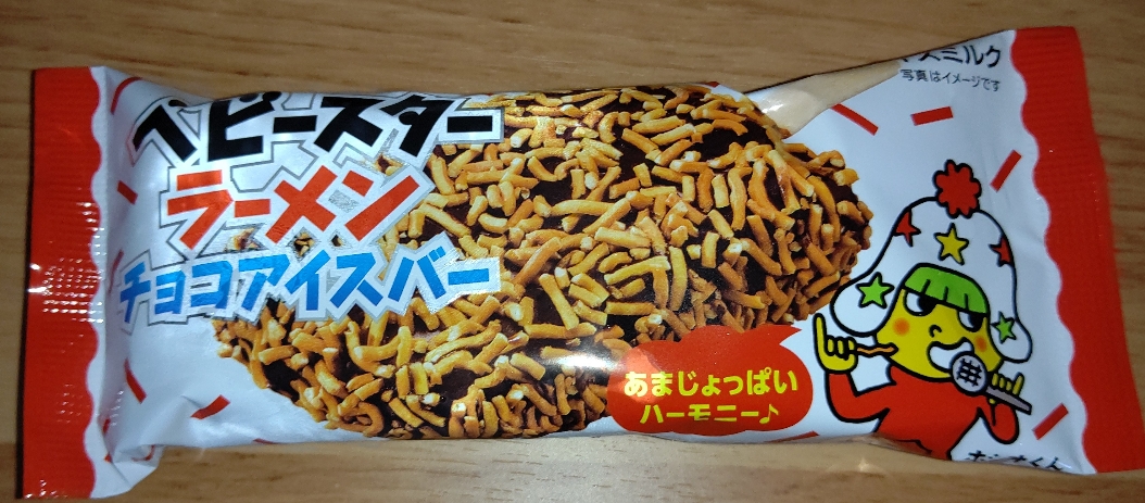 ベビースターラーメンチョコアイスバー!甘さとしょっぱさが合わさった不思議なおいしさ!このあまじょっぱさにヤミツキになりそうな人もいるかもしれません!興味ある方見かけたら是非!