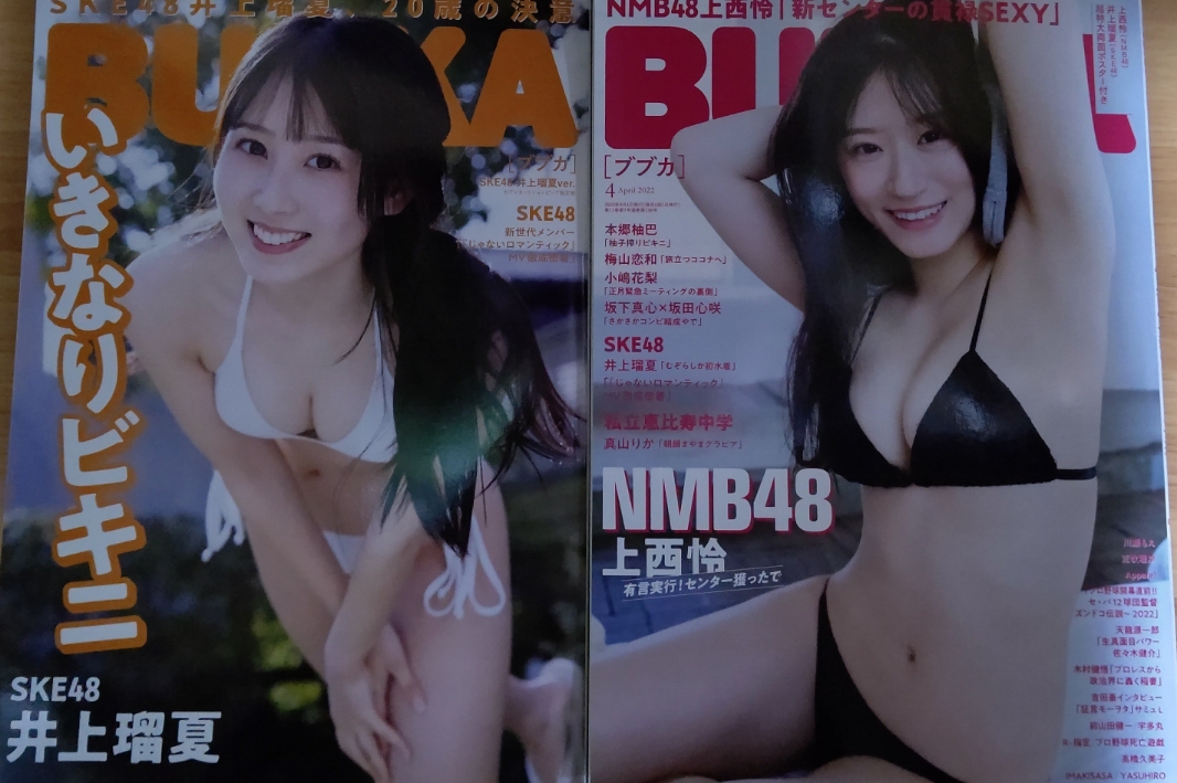 BUBKA2022年4月号の表紙をNMBの上西怜ちゃんがセブンネット限定版ではSKEの井上瑠夏ちゃんが務めた!2人とも表紙から性欲を刺激される水着ショット!グラビアに期待とおちんちんが膨らみます!最初にグラビアに登場したのは怜ちゃんで特に水着では大きなおっぱいを活かしたショット満載!さすがセンター!ますますエッチな水着グラビアに期待せずにはいられない!次はここ最近エッチな水着グラビアで頭角を現したNMBの本郷柚巴ちゃん!怜ちゃんに負けじと大きなおっぱいを活かしたエッチな水着ショットを魅せてくれてます!彼女にもますますエッチな水着グラビアに期待とおちんちん膨らませずにはいられません!そしてセブンネット限定版で表紙を務めた瑠夏ちゃん!新成人になりたてでBUBKAには水着で初登場!スレンダー美ボディを活かした水着ショットを魅せてくれました!AKBGのメンバーの1人としてこれをきっかけに水着グラビア展開してもらえるといいですな。さらに付録には怜ちゃん、瑠夏ちゃんの両面ポスターが付き!またセブンネット限定版では瑠夏ちゃんのポストカードも!楽しみたい方BUBKA2022年4月号を是非!