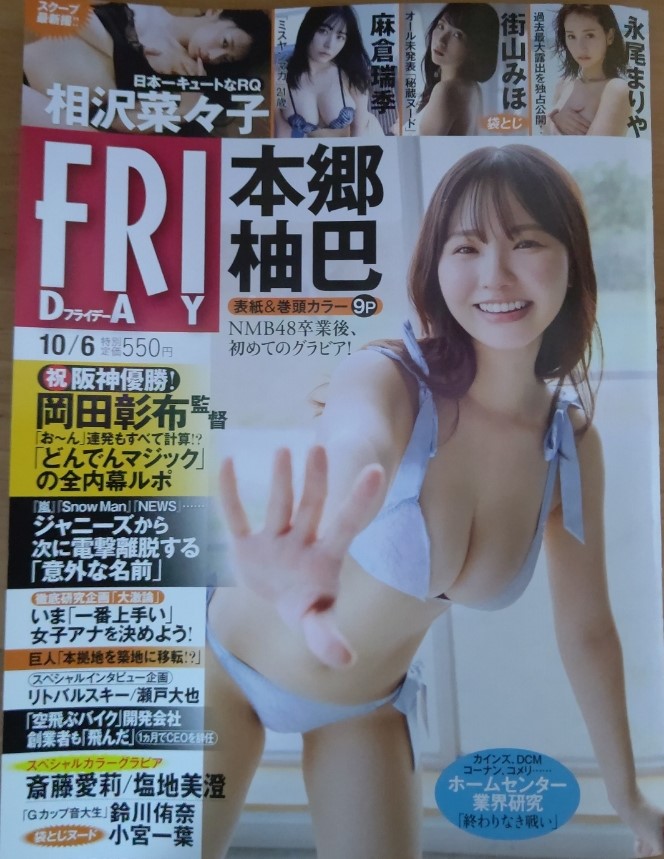 FRIDAY2023年10月6日号の表紙を元NMBの本郷柚巴ちゃんが務めNMB卒業後初の水着グラビアを展開!表紙からかわいい笑顔とボヨヨ~ンおっぱいを活かしたエロ眩しい水着ショットを魅せてくれた!卒業後も水着グラビアを展開してほしいという願っていた男の子にとって嬉しいサプライズ!グラビアで魅せた水着ショットはさらに磨きがかかりやはり柚巴ちゃんには今後も水着グラビアは続けてもらいたいと改めて感じさせられた!この卒業後初水着グラビアを機にさらにいろんなところで水着グラビアを魅せて欲しいですな!柚巴ちゃんだけではありません柚巴ちゃんに負けじと元AKBのまりやぎこと永尾まりやちゃんが過去最大の露出グラビアを魅せた!水着はもちろん!手ブラショットに下乳ショット!シャワーショット!さらにほぼすっぽんぽんでナイスタモリ倶楽部なお尻丸出しセクシーショットそして乳首とお毛毛をうまく隠してのすっぽんぽんショットまで!ここまでエッチなショットを魅せられたらますますエロエロ期待が膨らんじゃいます!楽しみたい方FRIDAY2023年10月6日号を是非!
