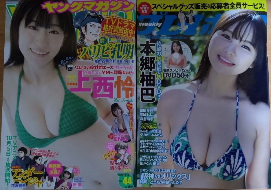 一方プレイボーイ2023年42・43合併号では元NMBの本郷柚巴ちゃんが表紙を務めた!柚巴ちゃんも負け時とかわいらしさと大きなおっぱいに思わず目が行っちゃう水着ショットを披露!これまた表紙から性欲沸かされます!今回の水着グラビアではかわいらしさだけでなく大人の表情を魅せた水着グラビアを魅せてくれた!かわくておっぱい大きくてエッチな体つきした柚巴ちゃんの水着姿にもおちんちんの勃起が止まりません!さらに付録には柚巴ちゃんのグラビア撮影風景とインタビューも入ったDVDが付いてきた!インタビューもあるということで50分と長めになってます!水着シーンもありますのでエロエロ楽しめます!楽しみたい方ヤングマガジン2023年44号プレイボーイ2023年42・43合併号を是非!