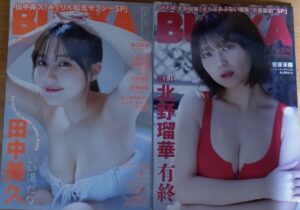 BUBKA2024年7月号の表紙を元HKTの田中美久ちゃんが別バージョンの表紙を6月末にSKEを卒業する北野瑠華ちゃんが務めた!表紙から共に水着でエロエロ期待させられます!グラビアで先陣を切ったのは美久ちゃんでかわいらしく大人びた水着グラビアを魅せ時にはかわいらしいながらも挑発的な顔つきを魅せることも!やはり美久ちゃんと言ったらボヨヨ~ンなおっぱいでエッチな体つき!かわいらしくても大人っぽくてもこれはもうたまらない!また美久ちゃんはビッグコミックスピリッツ2024年27号でも表紙・グラビアを務めこちらでもボヨヨ~ンなおっぱいとエッチな体つきを駆使したかわいくてエッチな水着グラビアを魅せてくれている!卒業後も精力的に水着グラビア展開してくれてありがたいですね!楽しみたい方ビッグコミックスピリッツ2024年27号(https://amzn.to/455WsT6)を是非!BUBKAに戻って美久ちゃんに続き瑠華ちゃんSKEラストにふさわしい水着グラビアを展開!美ボディを活かしたかわいらしくてエッチな水着ショットが魅力的!卒業後も水着グラビア魅せてくれたらいいですな!AKBGだけあってなかなかのエッチな美ボディしてるので水着グラビア続けないのはもったいないので!最後はSKEの菅原茉椰ちゃんが写真集のアザーカットを魅せそのうち1ページのみ黒の下着ショットをちょことだけ見せてくれた。できればもう少し水着や下着ショットを取り上げて欲しかった!さらに付録には美久ちゃんの挑発的な顔な水着ポスター!さらにセブンネット限定で美久ちゃんバージョンでは美久ちゃんの瑠華ちゃんバージョンでは瑠華ちゃんのポストカードが付いてきた!美久ちゃんのポストカードは3種類のうち1種類がランダムで入ってるシステムだったので今回は美久ちゃんバージョンは1冊のみ購入!3冊買っても同じのが出てしまう可能性あるので…。楽しみたい方BUBKA2024年7月号(https://amzn.to/4bIsMxU)を是非!