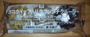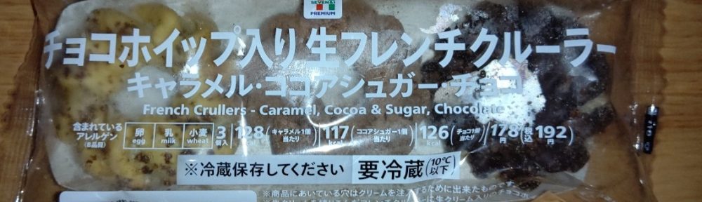 セブンのチョコホイップ入り生フレンチクルーラー!ミニサイズでキャラメル、ココアシュガー、チョコの生地の3つが入っていてその中にはそれぞれチョコホイップが入っている!クリームがそれぞれの味と絶妙に絡みおいしさを演出!ドーナツというよりスイーツな感じがしないでもない!見かけたら是非!