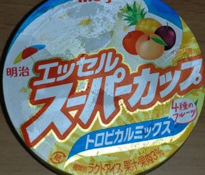エッセルスーパーカップトロピカルミックスアイス!りんご、もも、パイナップル、パッションフルーツの4種が混ざり夏にふさわしいアイス!食べたら口の中もトロピカルになります!期間限定っぽいので気になってる方お早めに!